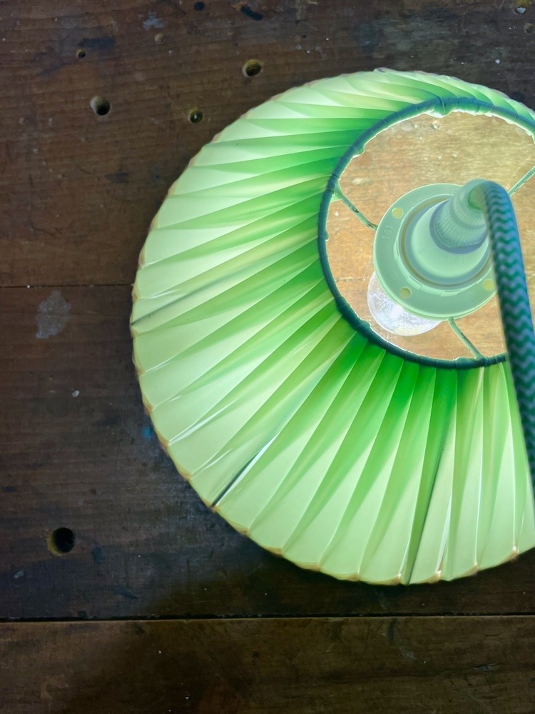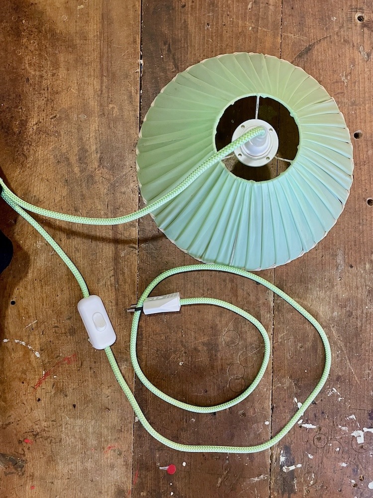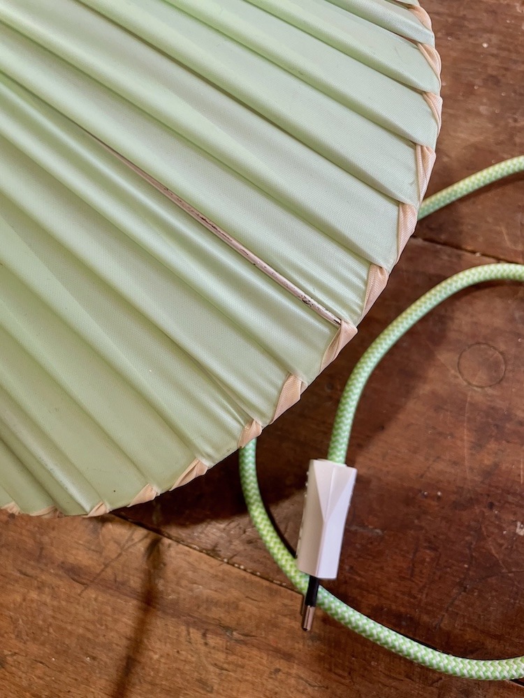 Une histoire qui me tient à cœur : J’ai créé cette baladeuse à partir d’un abat-jour vintage tissé avec un ruban plastique vert que j’ai déniché dans une brocante dans le Nord. Il était un peu défraîchi, un peu oublié... Mais je savais qu’il avait du potentiel. Après l’avoir nettoyé, remonté et réelectrifié, la voilà : prête à illuminer ta maison avec toute sa joie rétro.